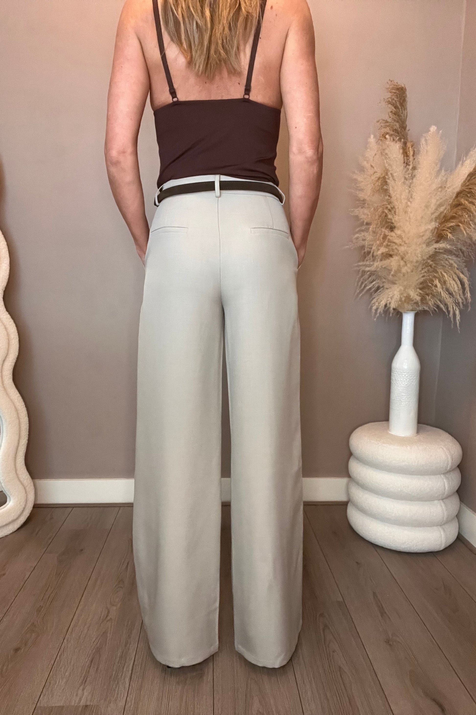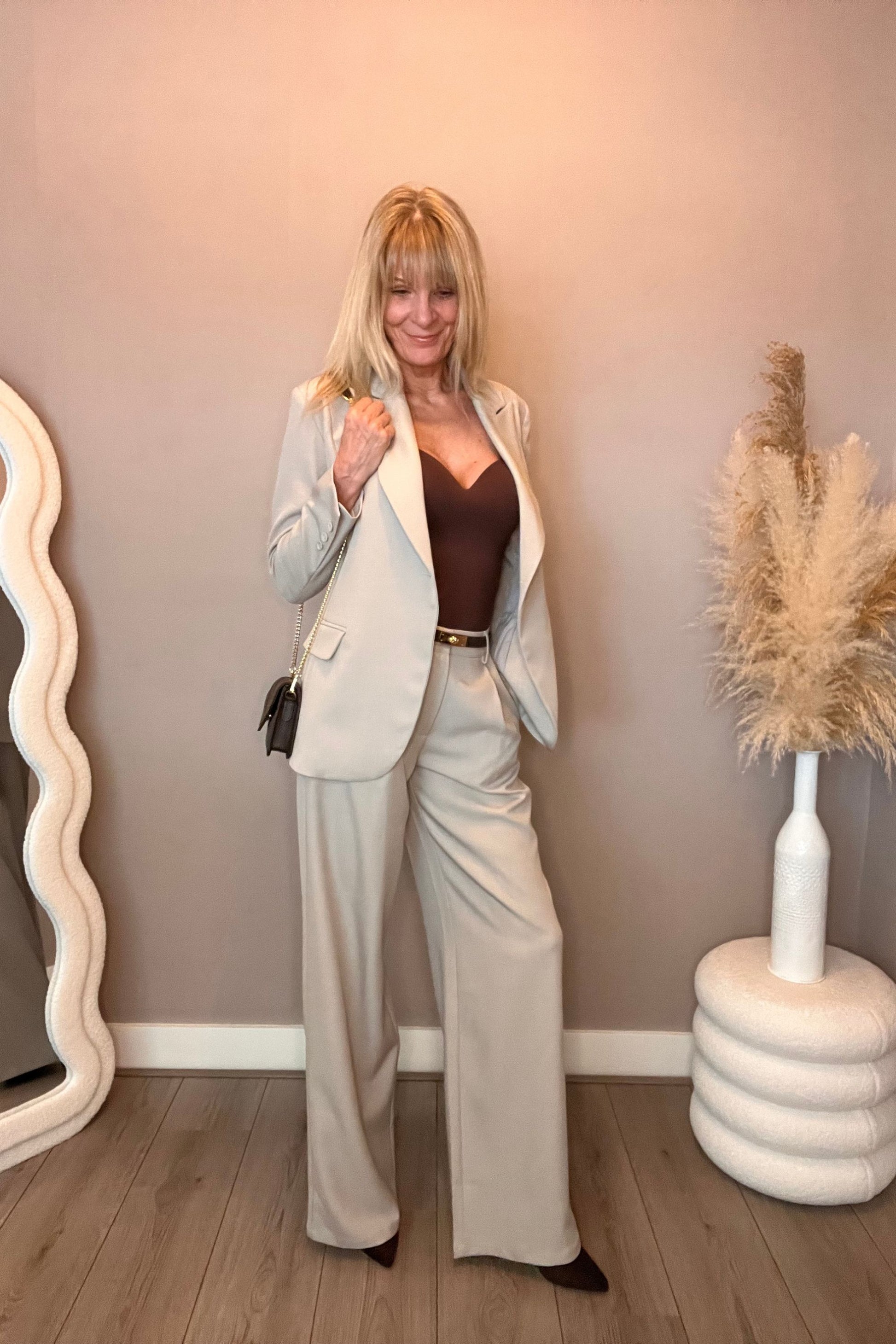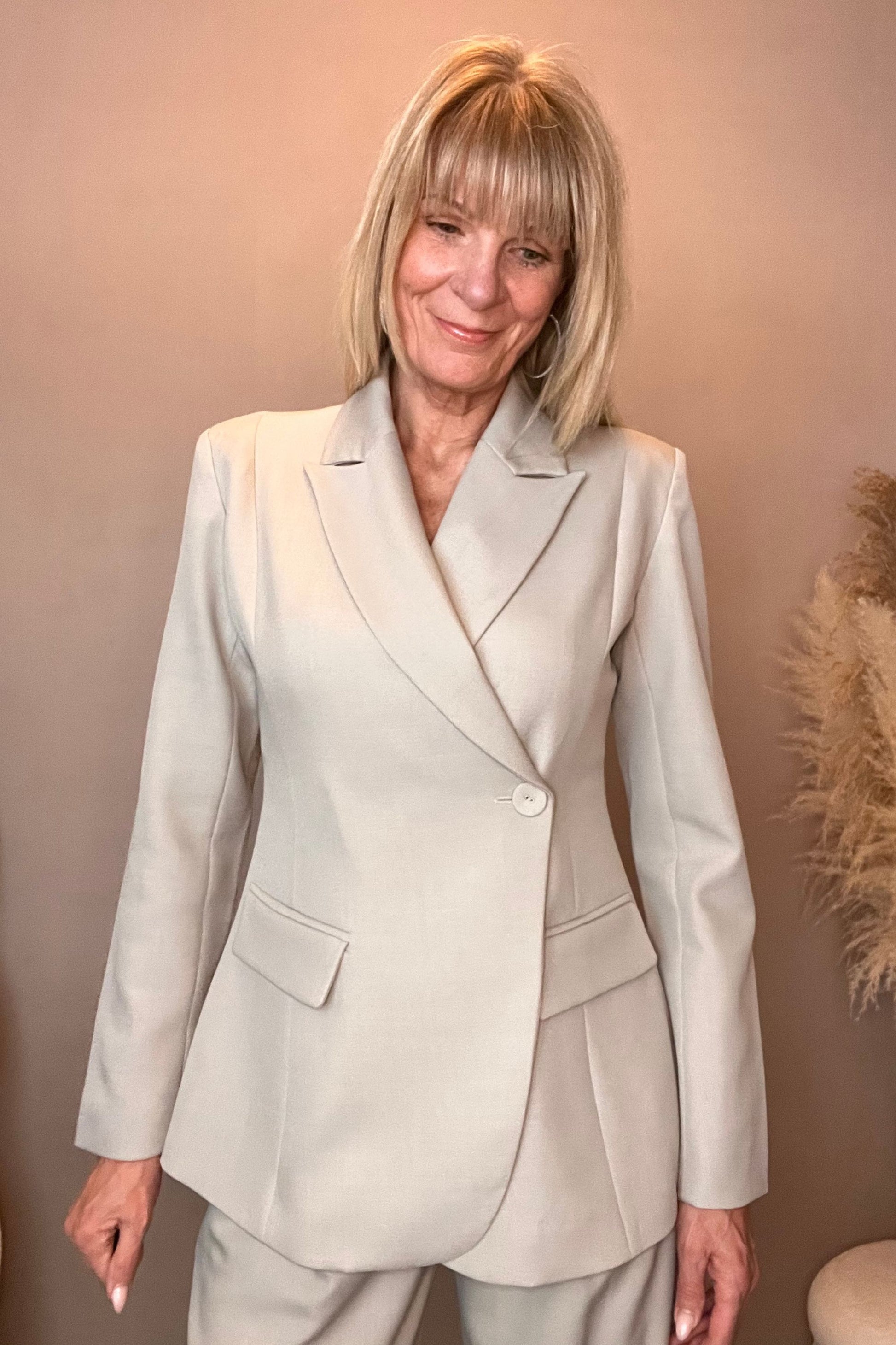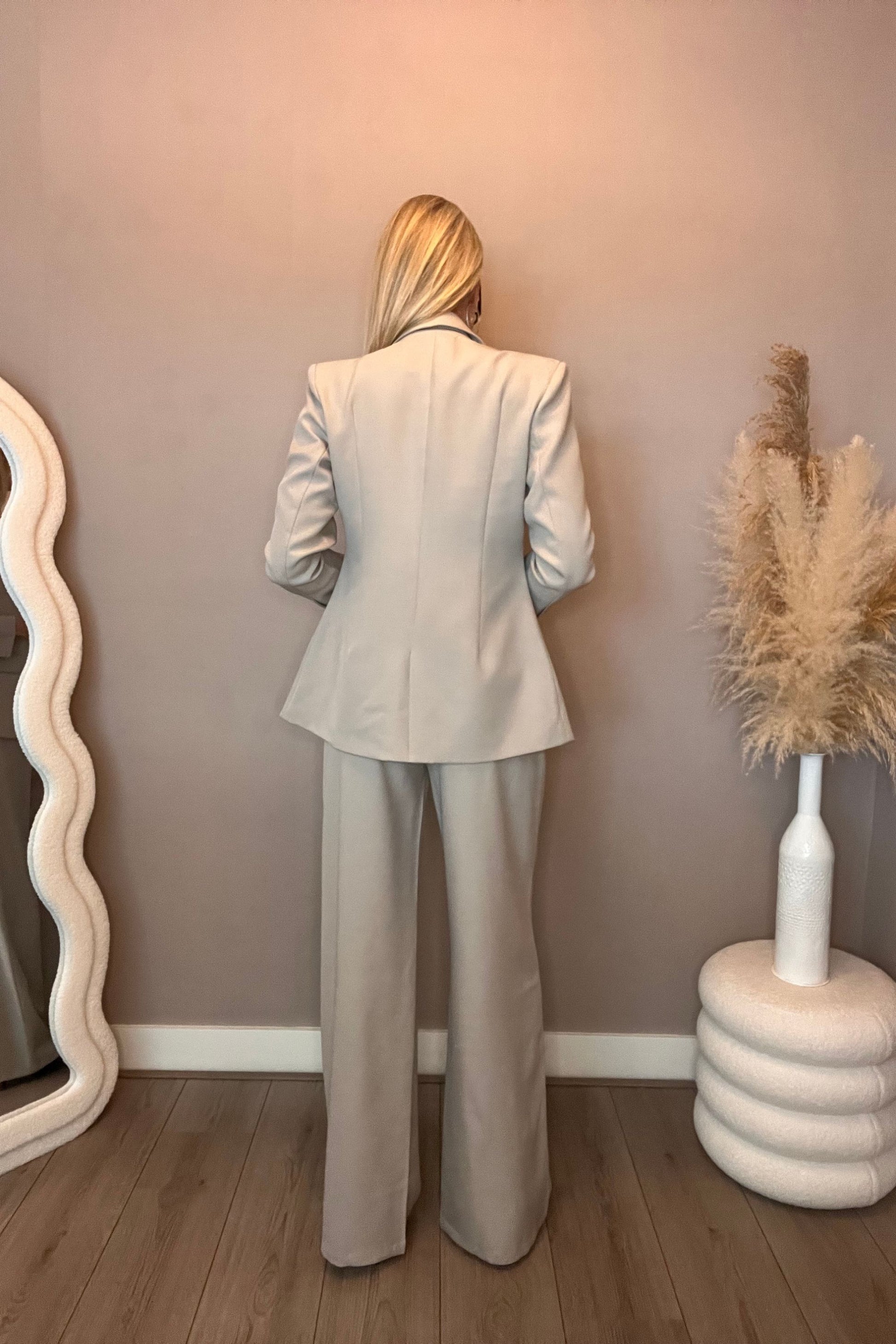 Dit mooie, stijlvolle twee-delig pak in een grijs/beige kleur bestaat uit een blazer en pantalon. De blazer is mooi getailleerd in een A-lijn en de pantalon valt hoog in de taille.