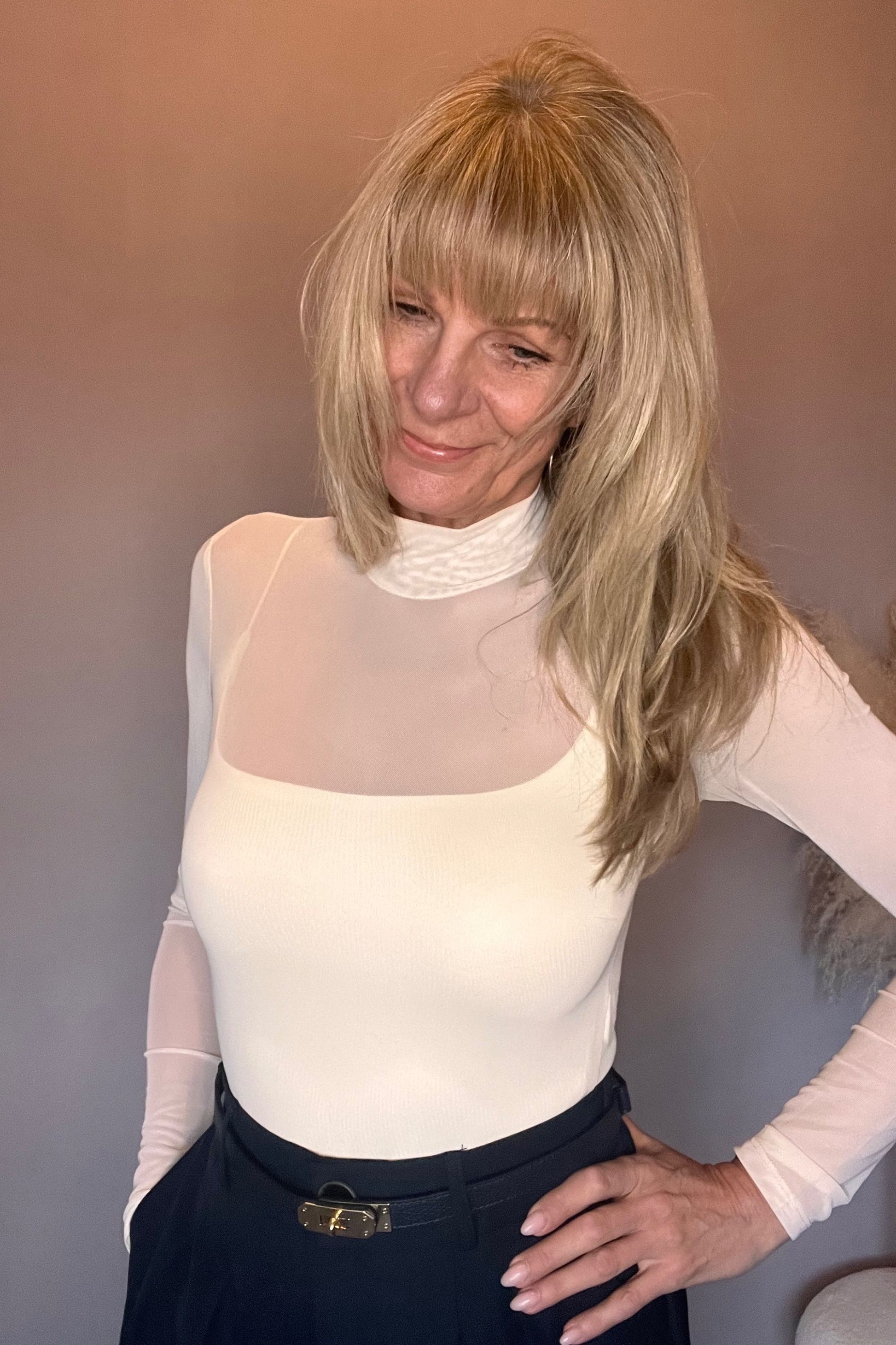 Twinbody Ecru: Two layers of pure comfort: a stretchy mesh bodysuit with a soft undertop that hugs your body like a second skin. The fabric feels wonderfully soft, while the small turtleneck and back opening provide an elegant finish. Wear it under a cardigan or wool sweater, or pair it with stylish jeans and a pair of high heels or sneakers, and you're all set. Also available in White.